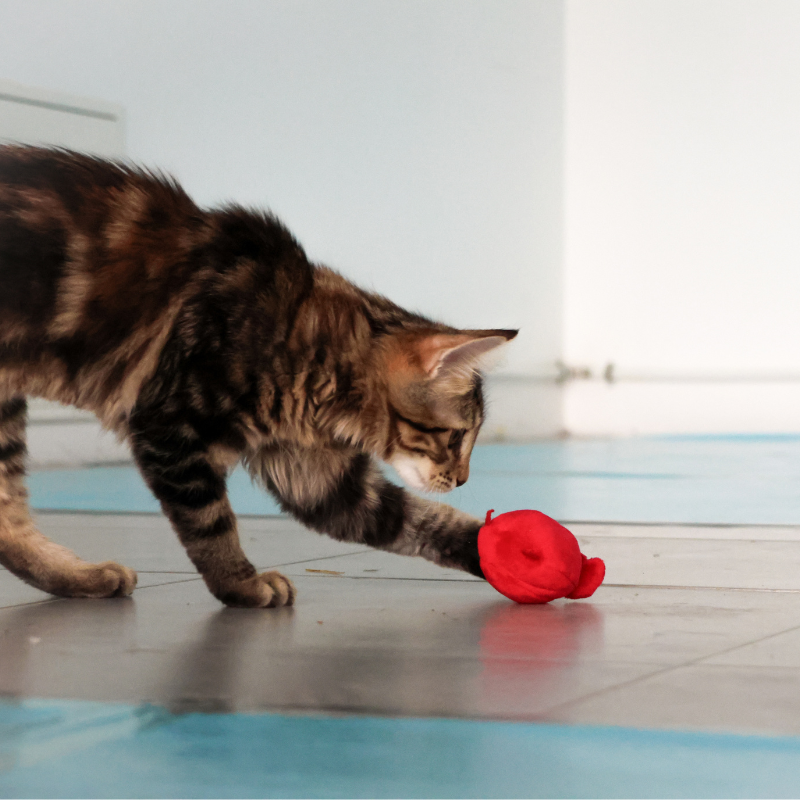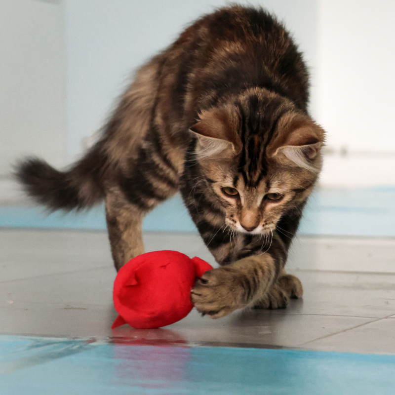 Sa texture invite au câlin et au jeu tactile. Sa taille (env. 7 cm × 9 cm × 5,5 cm) en fait un jouet pour chat idéal pour toutes les tailles et les âges. Elle est suffisamment petite pour être portée, tapée, lancée, sans danger pour tous gabarits félins.